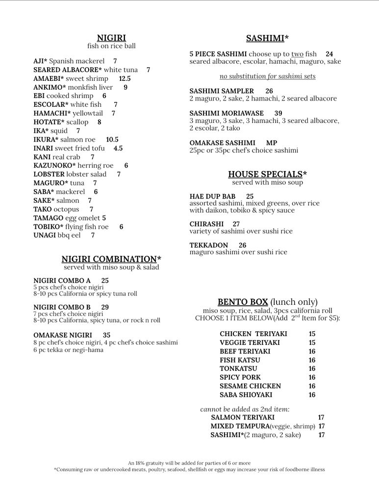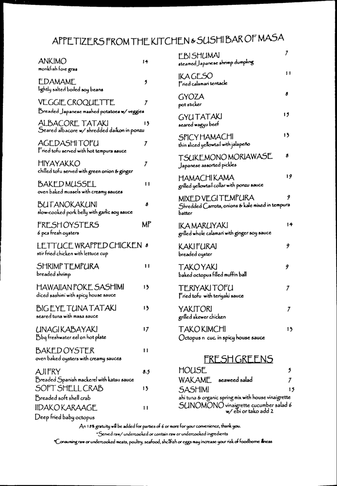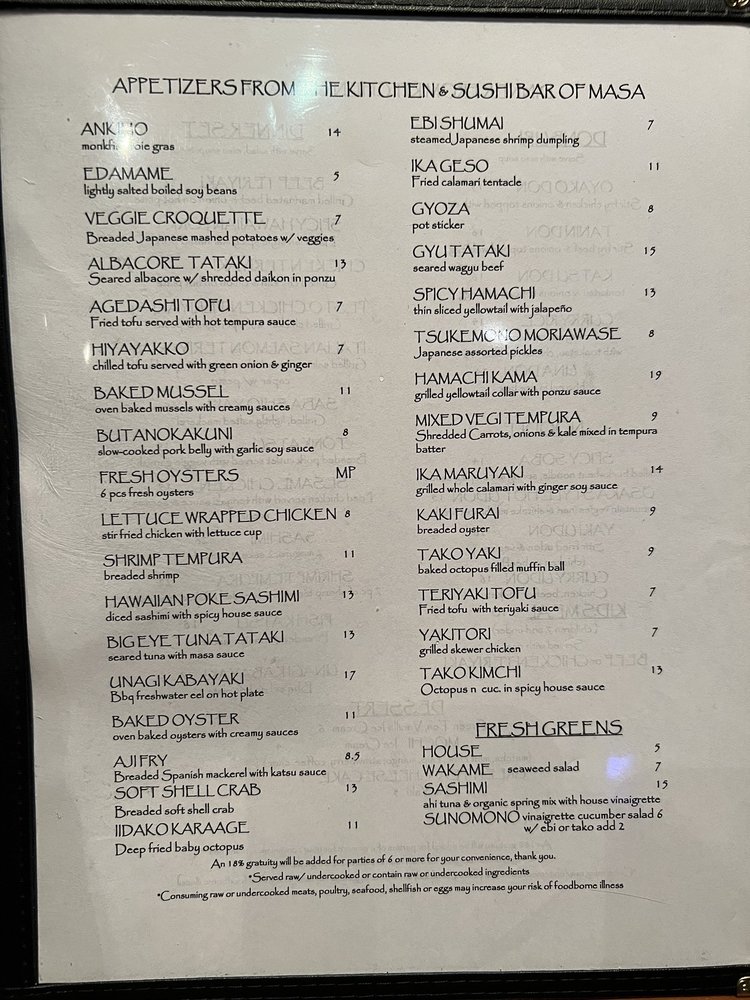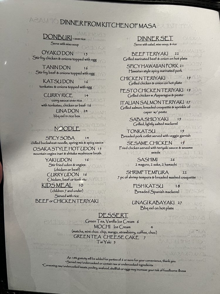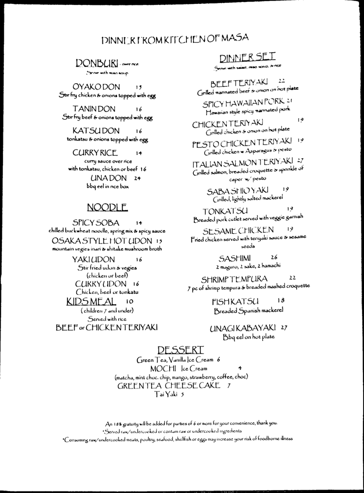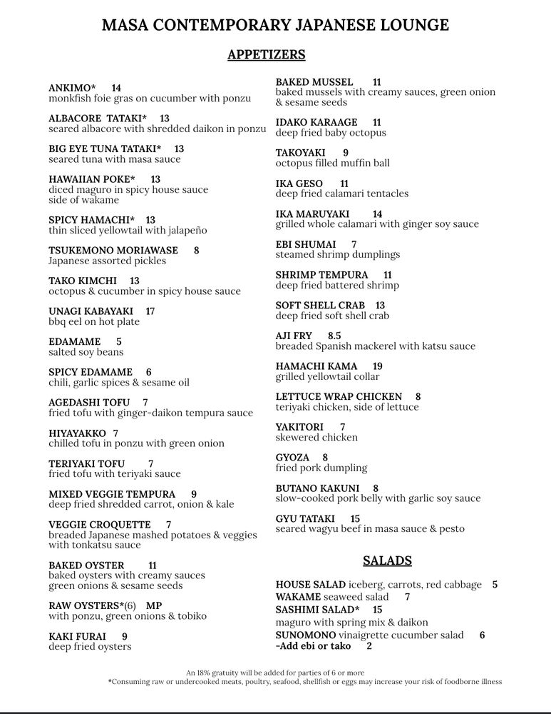 Introducing the menu at Masa Contemporary Japanese Lounge, located in Stockton, CA, where Japanese cuisine meets modern sophistication. This Asian-owned restaurant offers a variety of seafood options, including pescatarian and many vegetarian choices. The menu highlights fresh and innovative sushi rolls, like the signature "Candy Kane" roll filled with multiple types of fish, asparagus, and avocado. Customers praise the attentive staff, cozy atmosphere, and the welcoming vibe for families with young children. Standout dishes include the thick and juicy unagi, flavorful Japanese curry, and generously sized sashimi. With options for private dining, outdoor seating, and happy hour deals, Masa provides a memorable dining experience for both casual meals and group gatherings. Experience the perfect blend of tradition and creativity at Masa Contemporary Japanese Lounge.